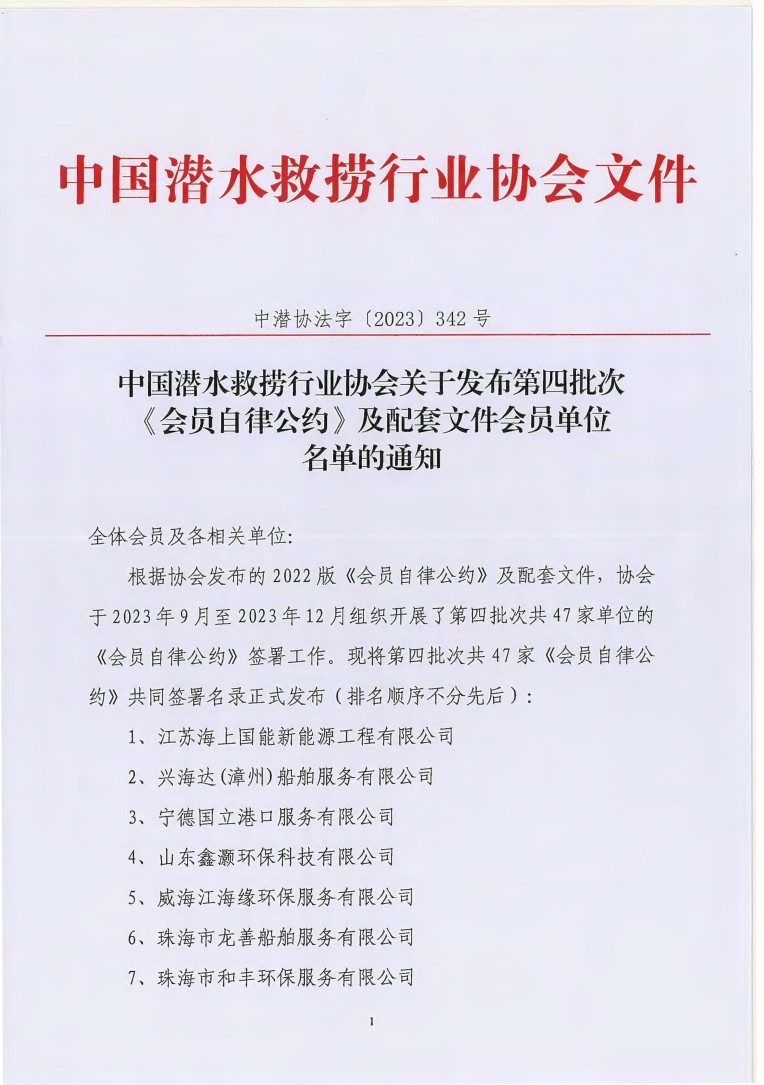 中國潛水救撈行業(yè)協(xié)會關(guān)于發(fā)布第四批次《會員自律公約》的通知
