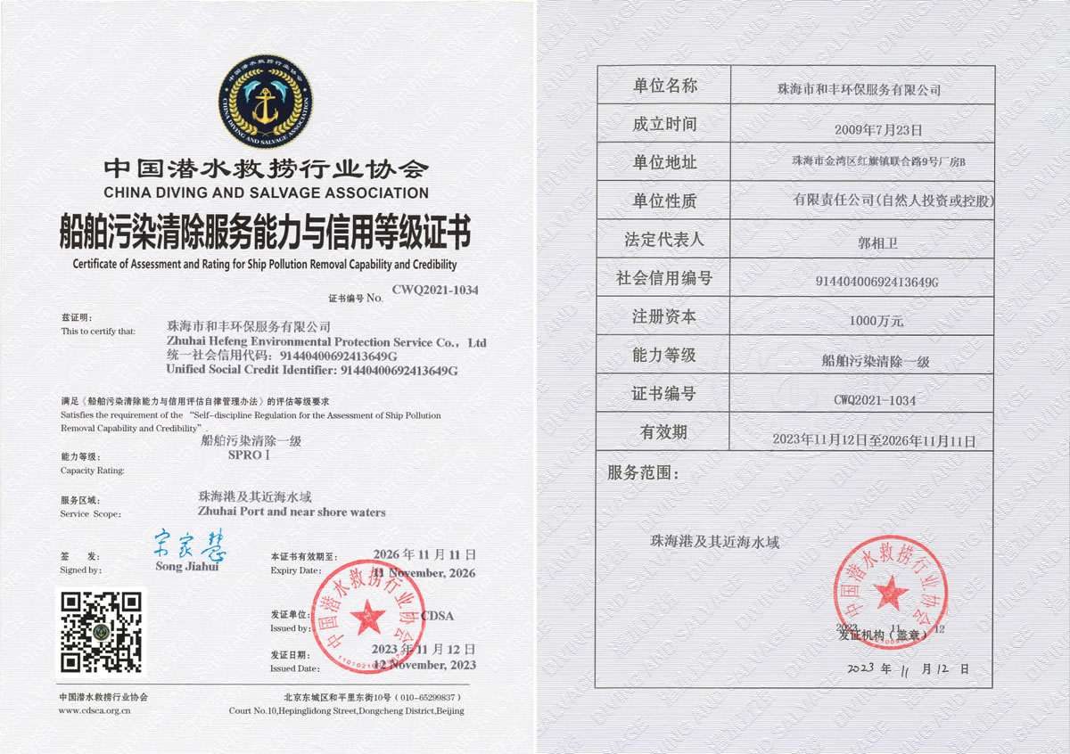 導(dǎo)語:珠海市和豐環(huán)保服務(wù)有限公榮獲司中國潛水救撈行業(yè)協(xié)會《船舶污染清除服務(wù)能力與信用等級證書》,獲得船舶污染清除一級證書,服務(wù)區(qū)域覆蓋珠海港及其近海水域,為珠海環(huán)境保護服務(wù)增添新動力。