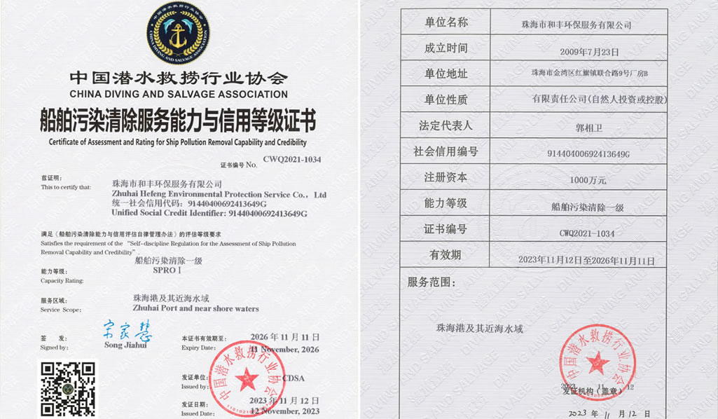 珠海市和豐環(huán)保服務(wù)有限公榮獲司中國潛水救撈行業(yè)協(xié)會《船舶污染清除服務(wù)能力與信用等級證書》,獲得船舶污染清除一級證書,服務(wù)區(qū)域覆蓋珠海港及其近海水域,為珠海環(huán)境保護(hù)服務(wù)增添新動力。… |
